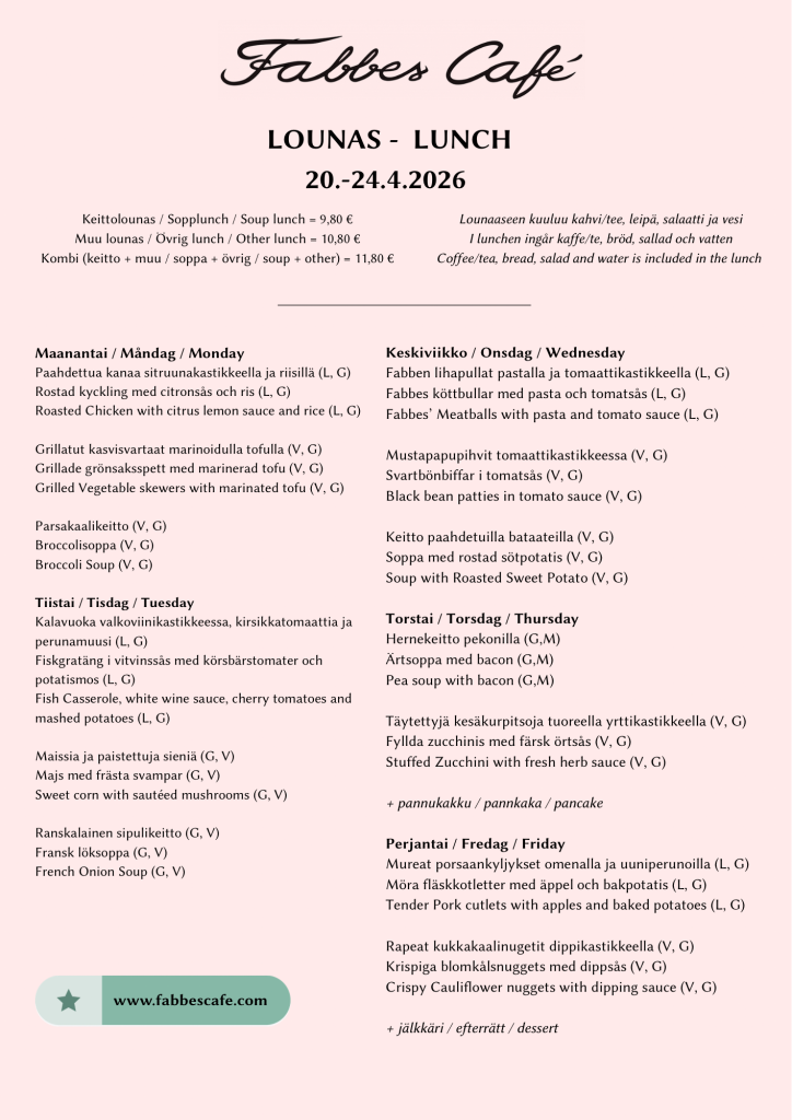 Lounaaseen kuuluu salaattipöytä, leipä ja kahvi/tee. Torstaisin ja perjantaisin tarjoamme myös pienen jälkiruoan.