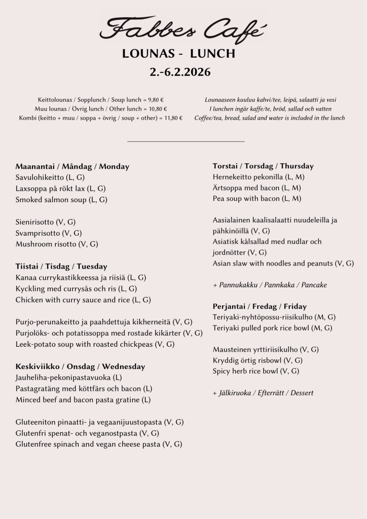 Ändringar i lunchlistan kan göras vid behov. Vi strävar efter att meddela om dem på förhand.