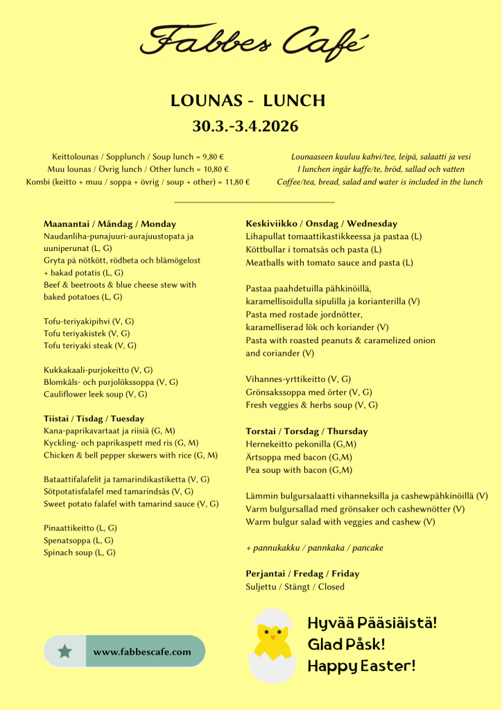Soppor 9,80 €, övrig mat 10,80 €. Lunch må-fre fr.o.m. kl 11.